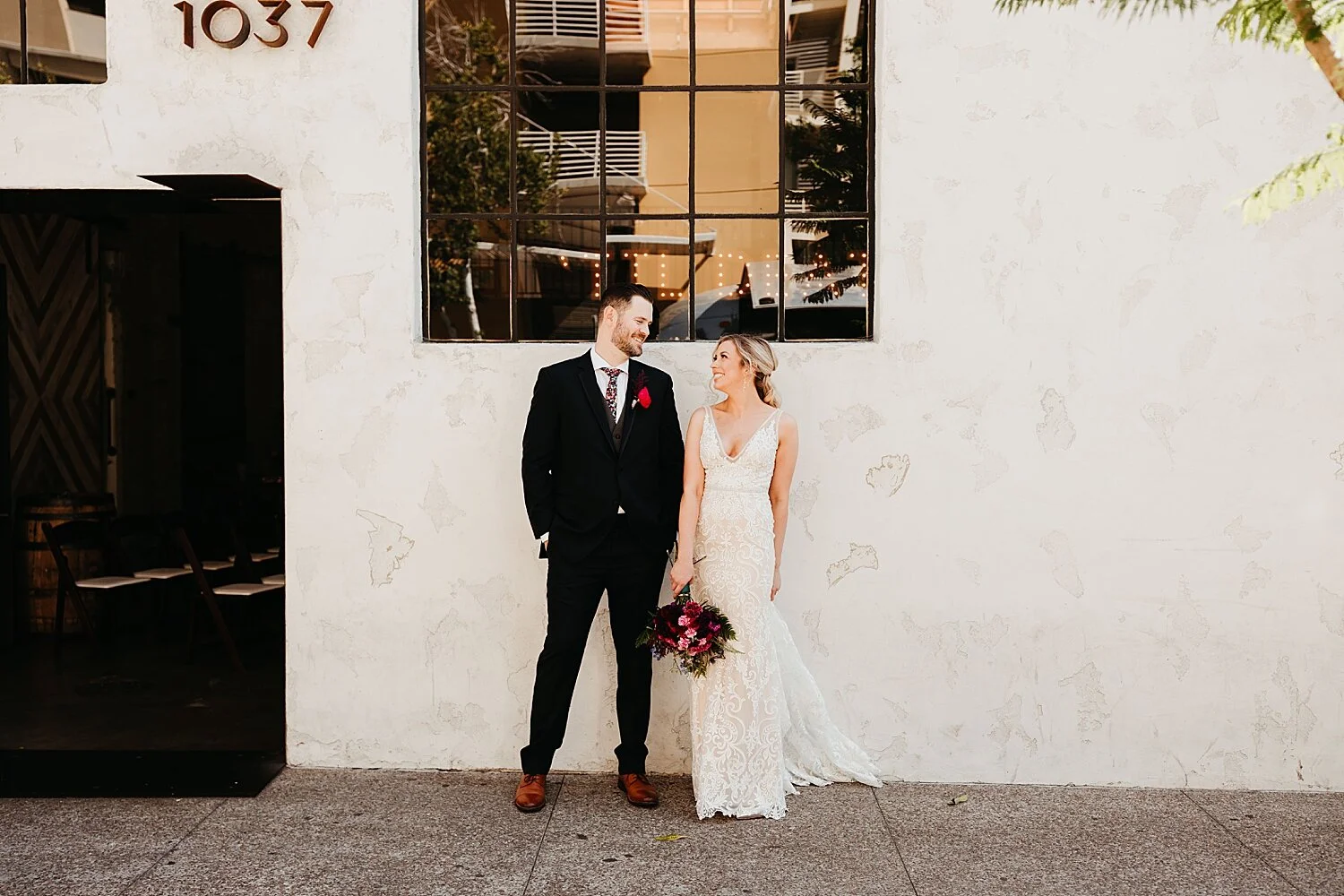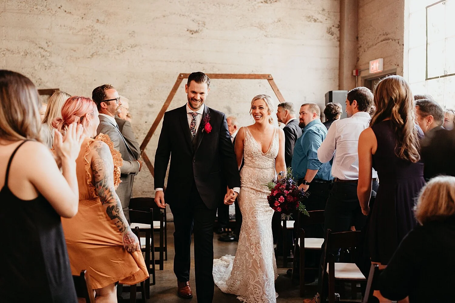From a photographers perspective - there were soooo many highlights that made me so creatively excited. Luce Loft’s vibe totally fit their wedding - a little bit edgy and industrial and sooooo gorgeous. I loved the bridesmaid’s mismatched gem-toned dresses and matching florals (they made their own bouquets!), the strong hexagon theme throughout, Ashley’s leather jacket art she painted herself (THIS GIRL IS SO CRAFTY), her ‘space barbie’ shoes, and the natural shapes and architecture of Luce Loft complimented it all so well. Not to mention Ashley’s nail art was a freakin CONSTELLATION - the wedding day was just filled with little details like that and it pulled it altogether so well. An absolute highlight for me was her getting-ready space - she found the coolest airbnb with palm walls and a view of the city and Coronado Bridge! It really adds soooooo much to have a cool getting-ready space - those shots of her in front of that palm wall are some of my favorite of the day. My last highlight I’ll mention… hearing the song “Cardiac Arrest” playing for their first dance - it’s one of my favorite all-time songs that I’ve never heard at a wedding. It’s definitely not your average ‘wedding song,’ and is totally a great example of how cool they are. ;)